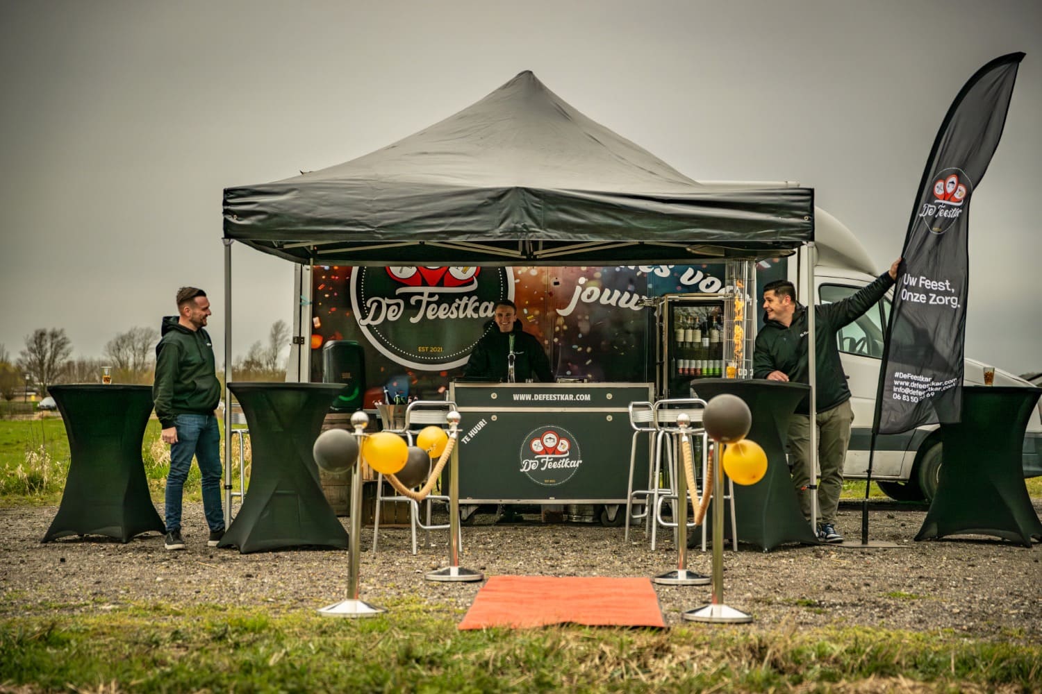 Van statafels met nette rokken tot een volledig ingerichte bar met een werkende tap; wij leveren en installeren alles op de juiste plek. Je hoeft zelf niet te slepen met zware spullen. Wij zorgen dat alles stevig staat en na het feest breken we de hele boel weer voor je af.